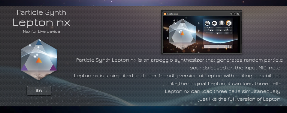 Particle Synth Lepton nx is an arpeggio synthesizer that generates random particle sounds based on the input MIDI note, producing up to 5 voices of 16th-note particles. This synthesizer creates a different random timbre each time, with each particle sound generated individually.