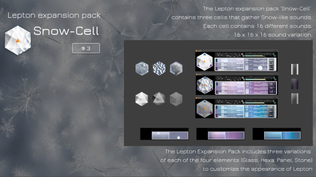 The Lepton Expansion Pack includes three variations of each of the four elements (Glass, Hexa, Panel, Stone) to customize the appearance of Lepton
